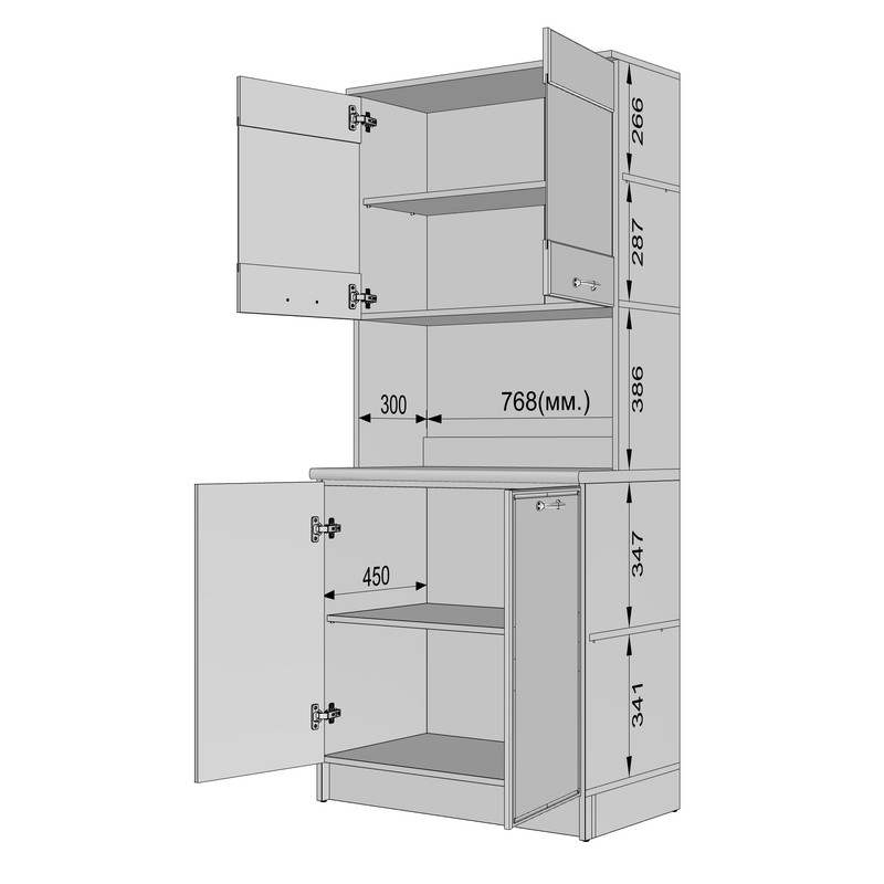 Нижній модуль: Місткі відділення з розпашними дверцятами для габаритного посуду, техніки або текстилю.