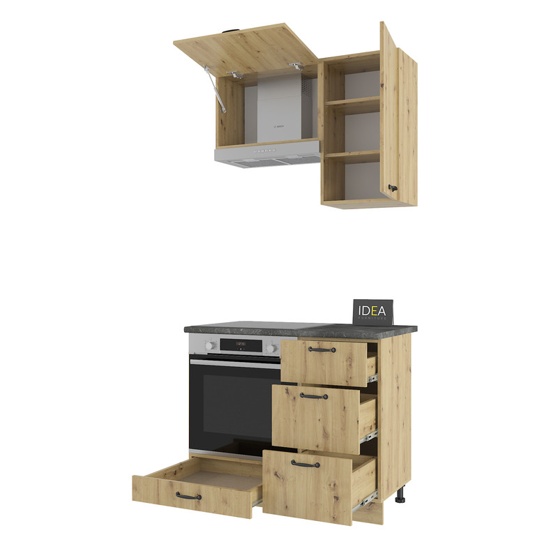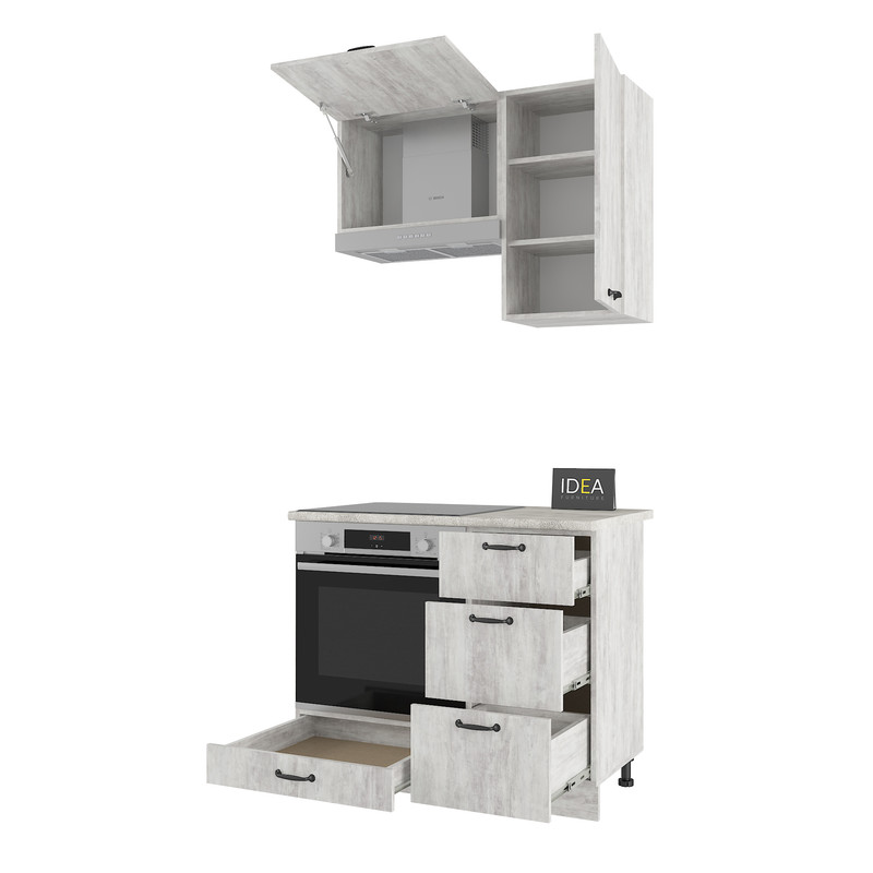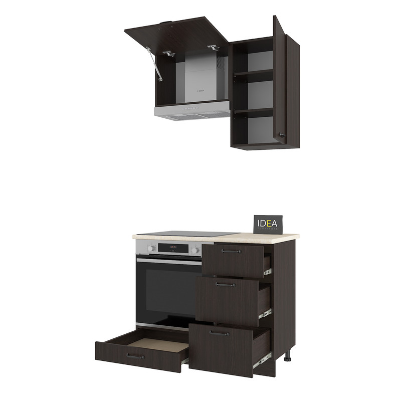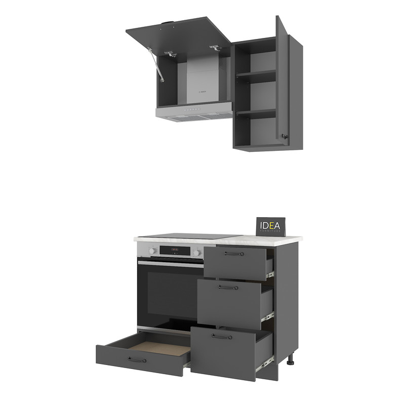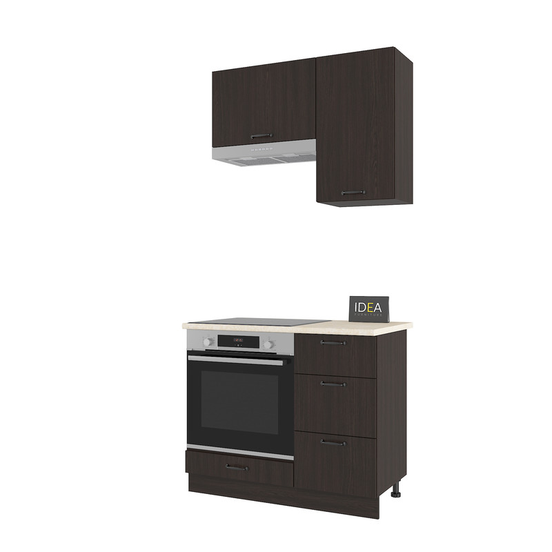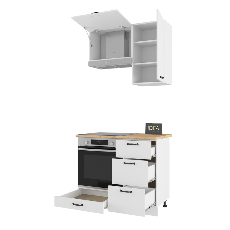 Гарнітур IDEA Н-23 — це ідеальне рішення для невеликих кухонь, де важливо раціонально використовувати кожен сантиметр простору. Ця модель вирізняється наявністю трьох висувних шухляд, що забезпечує зручний доступ до дрібного кухонного інвентарю.