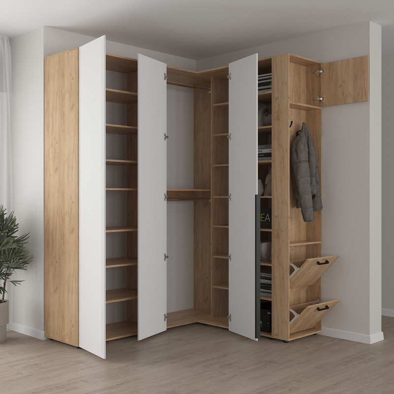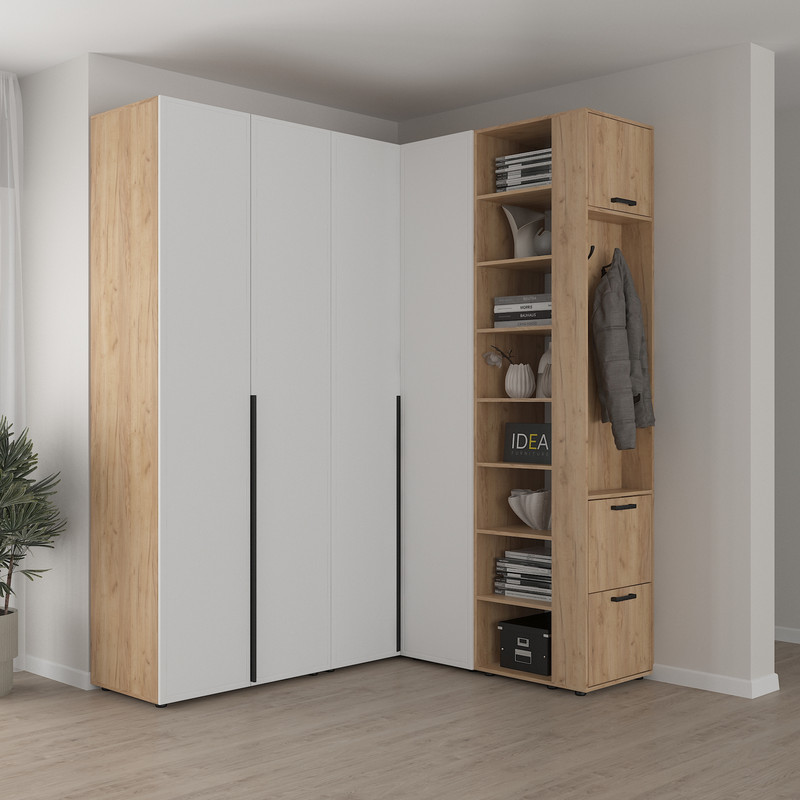 Кутове доповнення Смарт‑13 встановлюється поруч із основною шафою, що дозволяє створити кутову лінію зберігання одягу. Така конструкція ідеально підходить для спальні, гардеробної або передпокою, де потрібно використовувати кутовий простір максимально раціонально