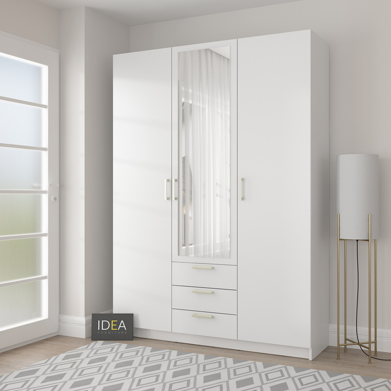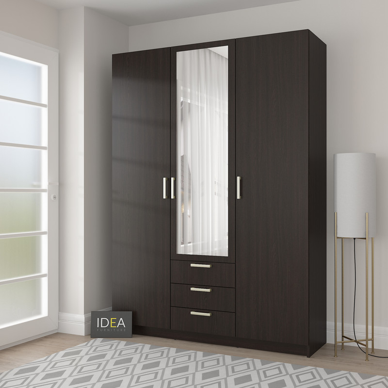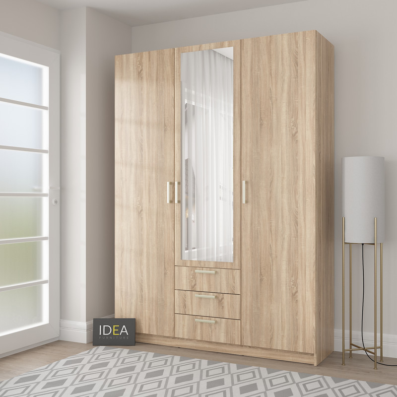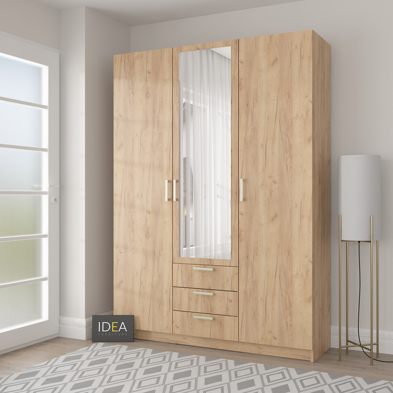 Стильна та містка тридверна шафа Д-119 — відмінне рішення для спальні , гардеробної або гостьової кімнати. Модель поєднує в собі секцію для одягу на вішаках, поличкове зберігання та три зручні висувні шухляди. Дзеркало по центру візуально збільшує простір і додає функціональності. Матеріали: