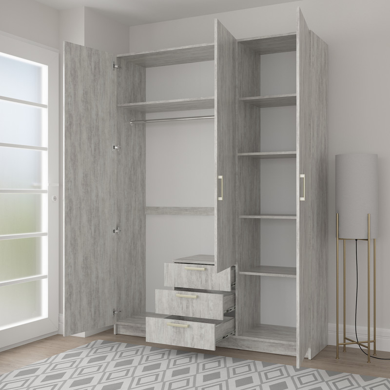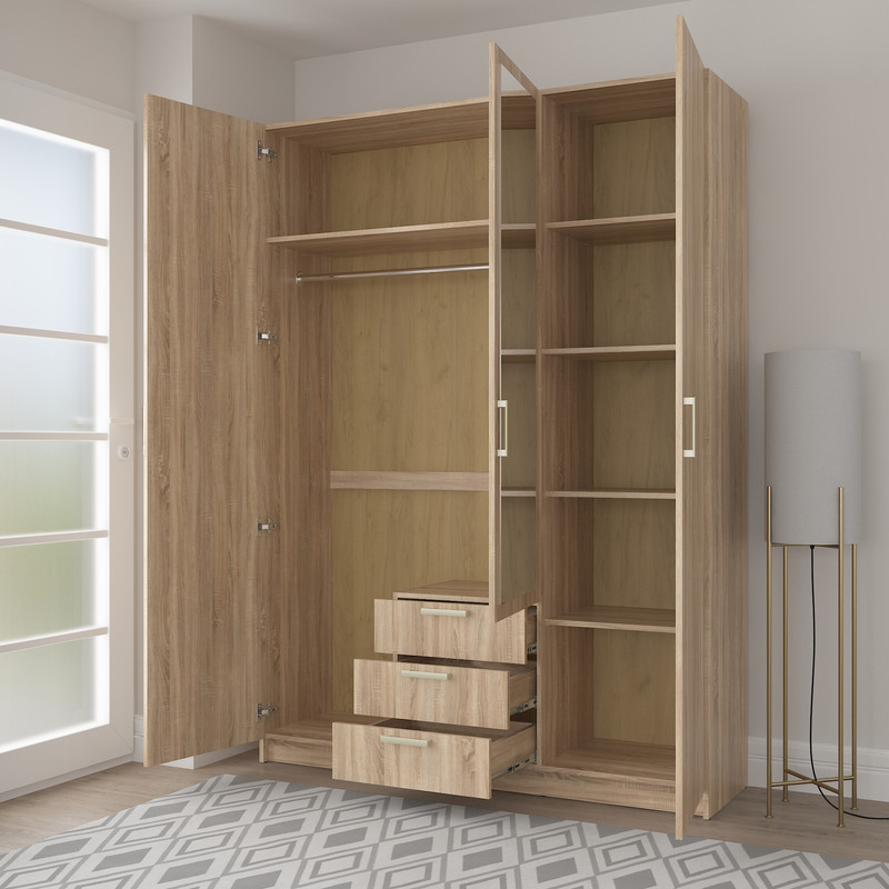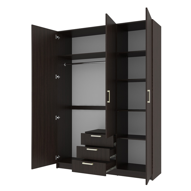 Стильна та містка тридверна шафа Д-118 — відмінне рішення для спальні , гардеробної або гостьової кімнати. Модель поєднує в собі секцію для одягу на вішаках, поличкове зберігання та три зручні висувні шухляди. Матеріали: