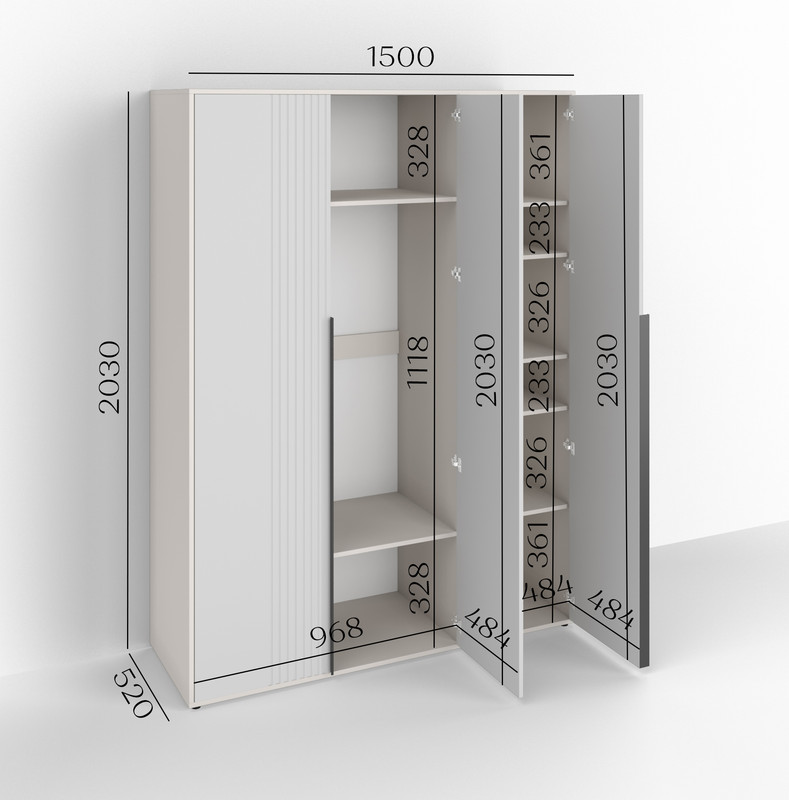 Вміщує велику кількість одягу — секції зі штангами та полицями