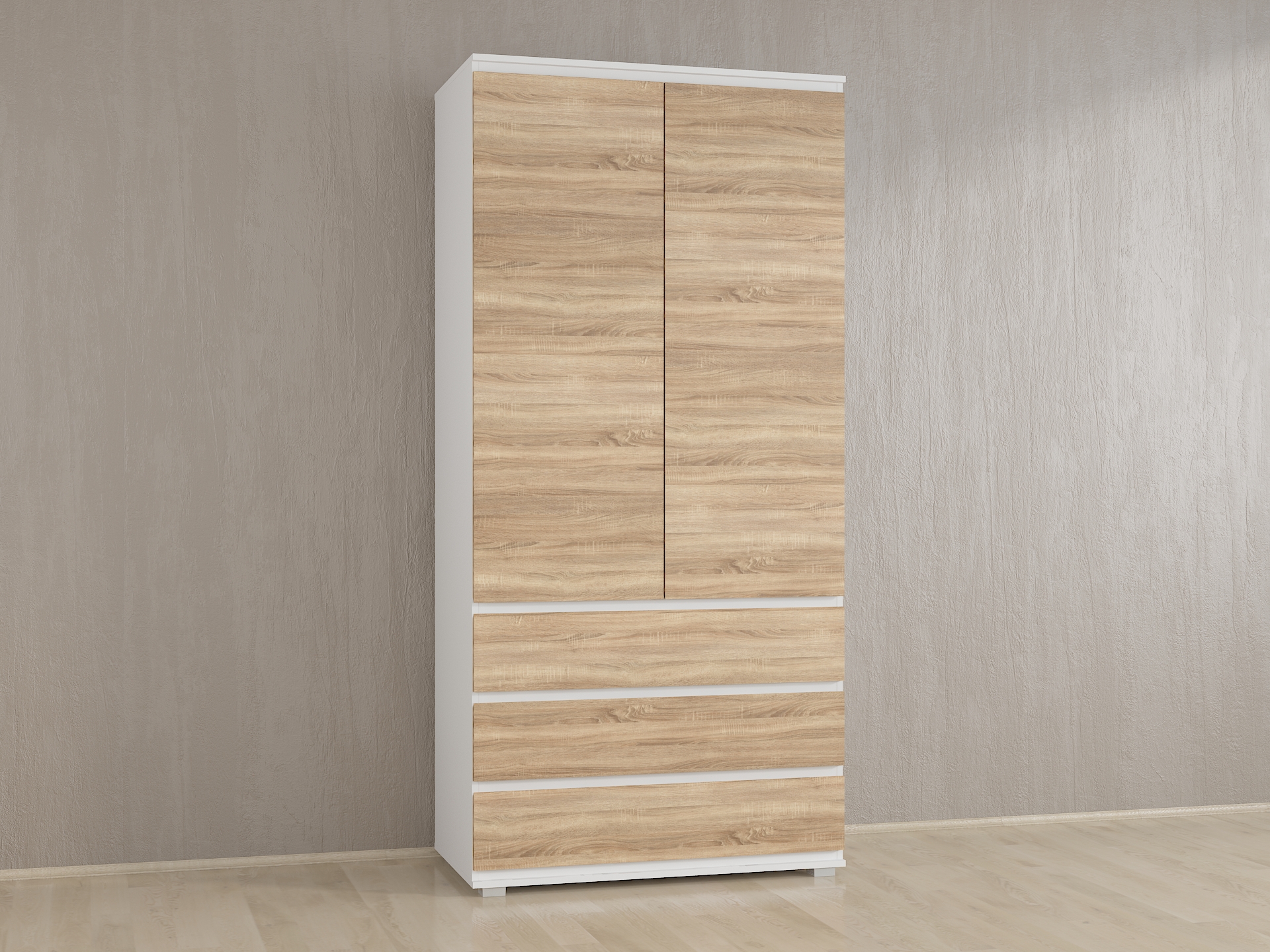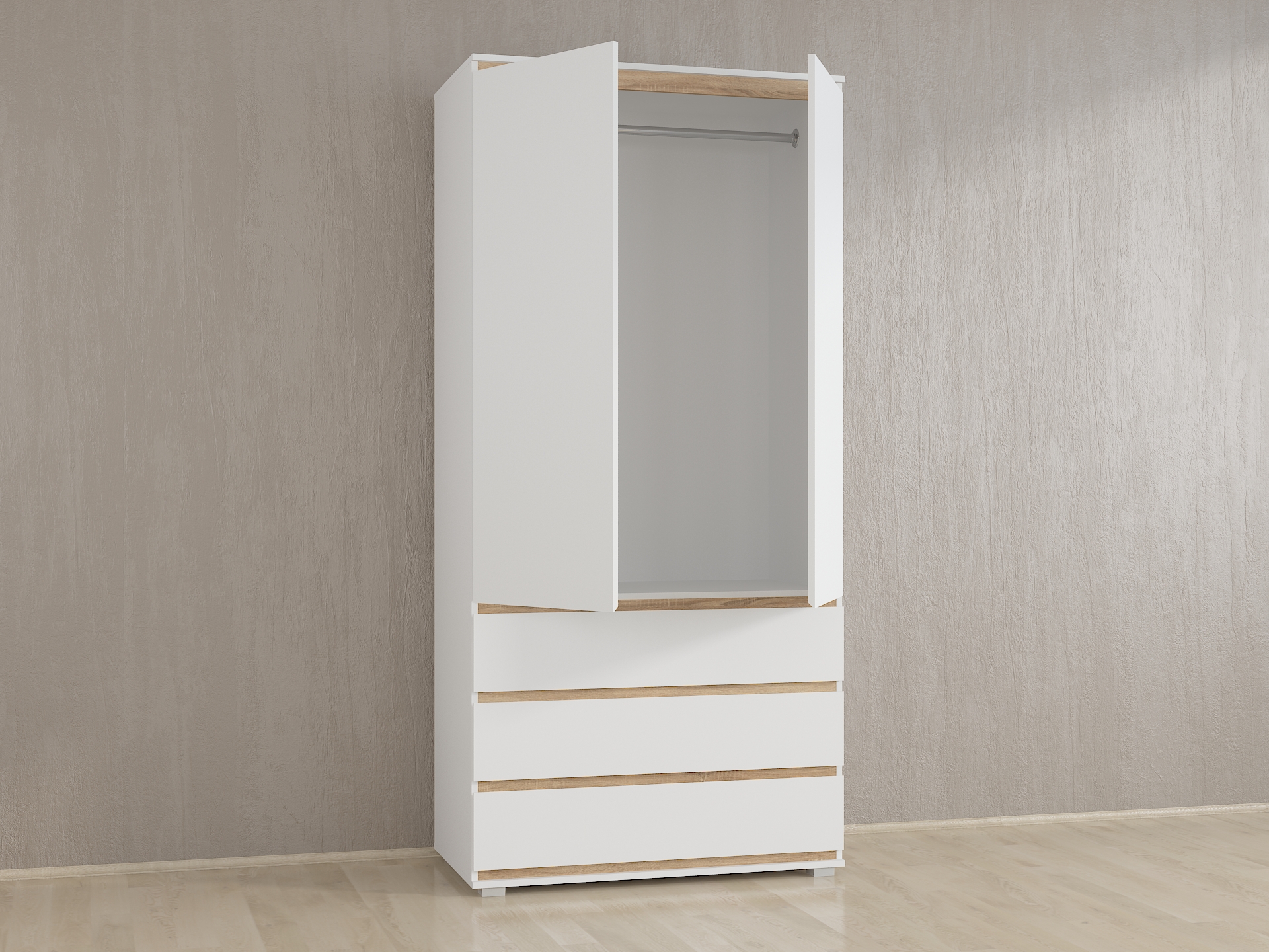 Висока шафа Б-2 зі штангою для вішалок і трьома місткими шухлядами знизу — ідеальний варіант для спальні, передпокою або гардеробної. Стильний дизайн без ручок додає їй лаконічності й сучасного вигляду.
